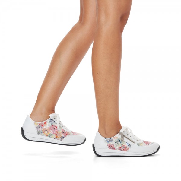 Baskets blanches avec des fleurs, très confortables de la marque Rieker, disponibles de la taille 35 à 42.